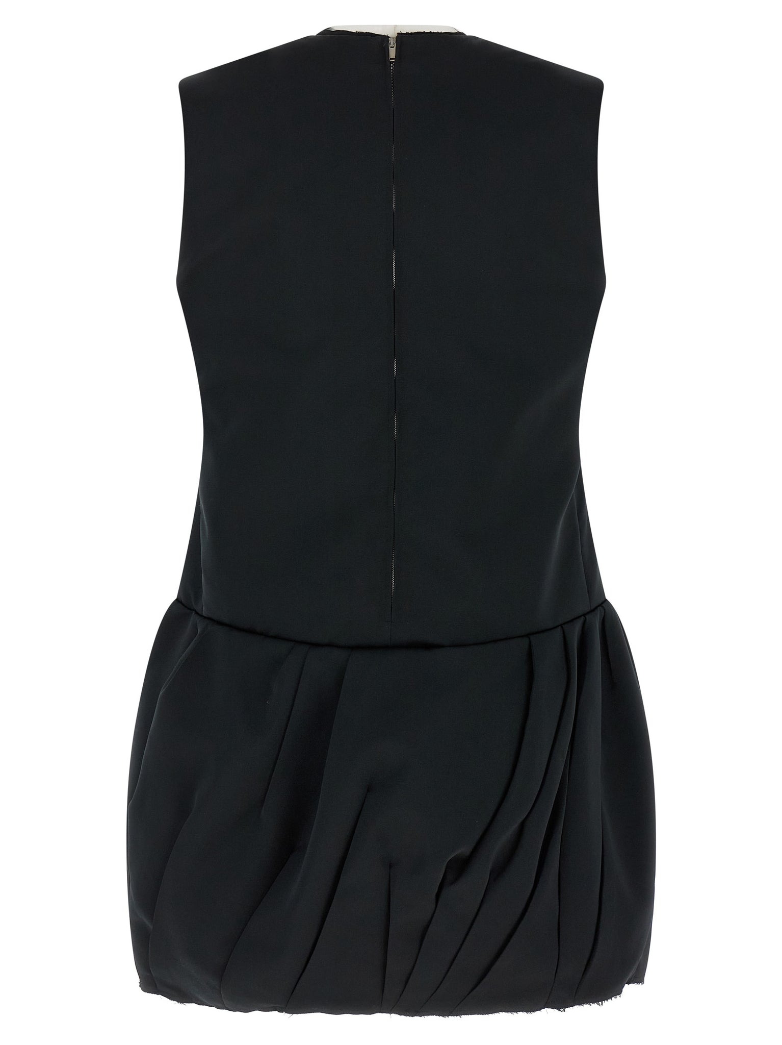 '240' technical duchesse mini dress, V-neck with several layers of contrasting fabric, Sleeveless, Balloon skirt with irregular pleats, Raw cut hem and back zip closure. Size and Fit - true to size fit - GERMAN size