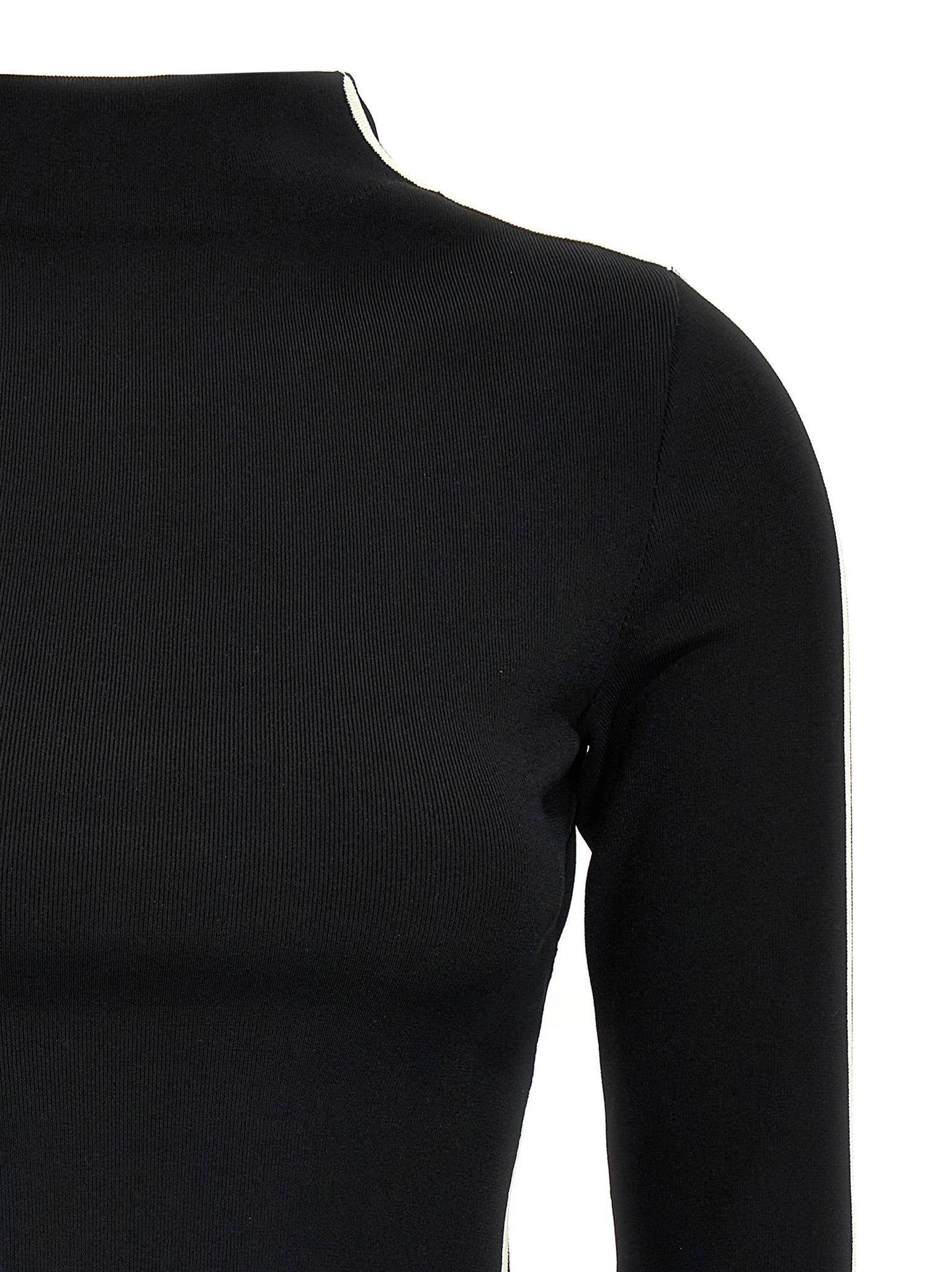 'Adda' knit sweater in viscose blend crepe with contrast details, raised neck, porthole on the back, long sleeves. Size and Fit - true to size fit