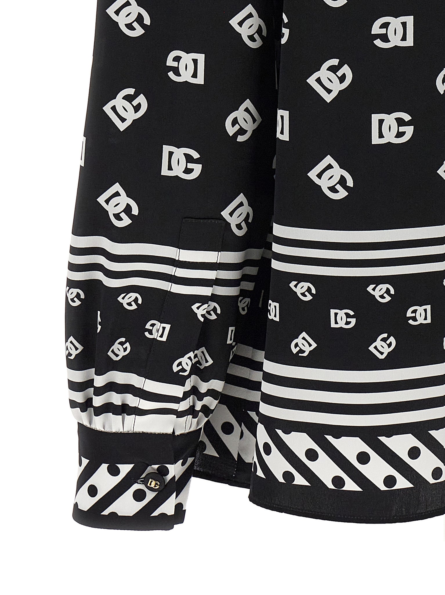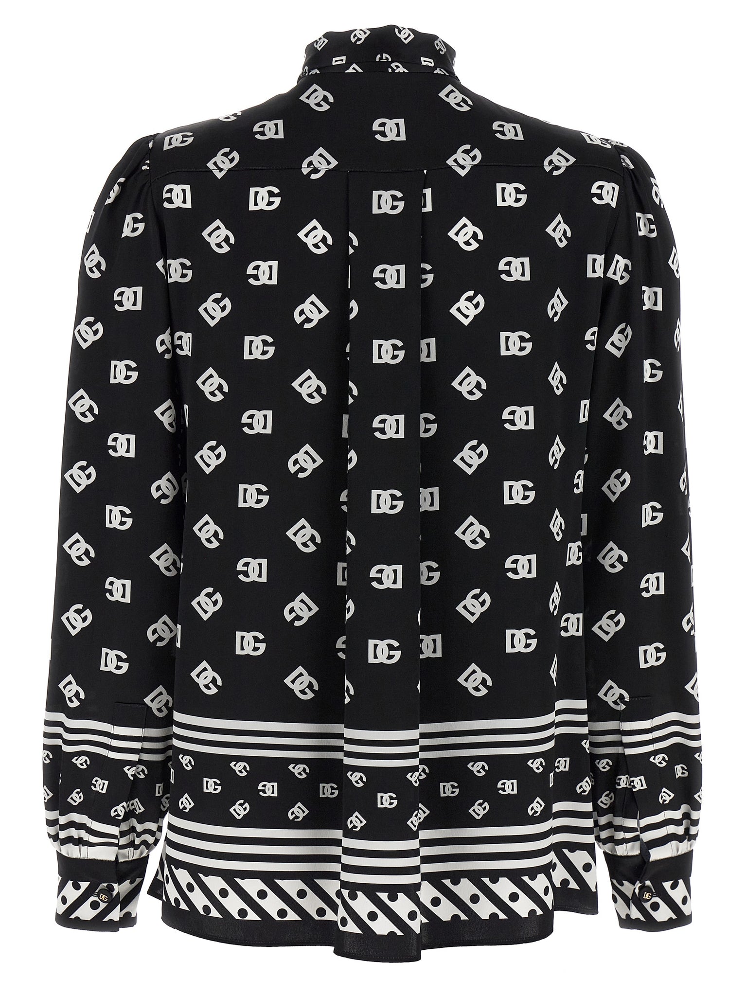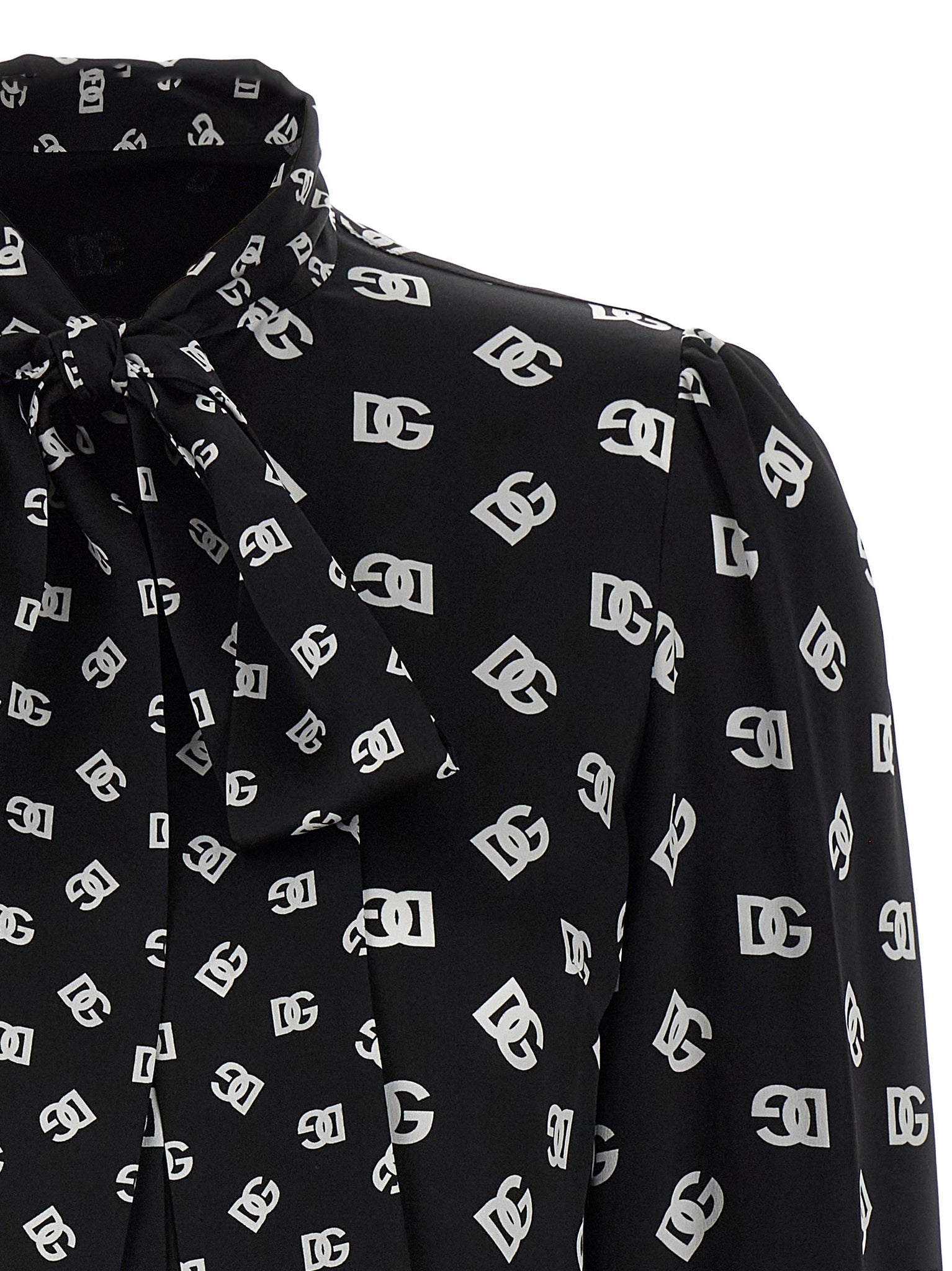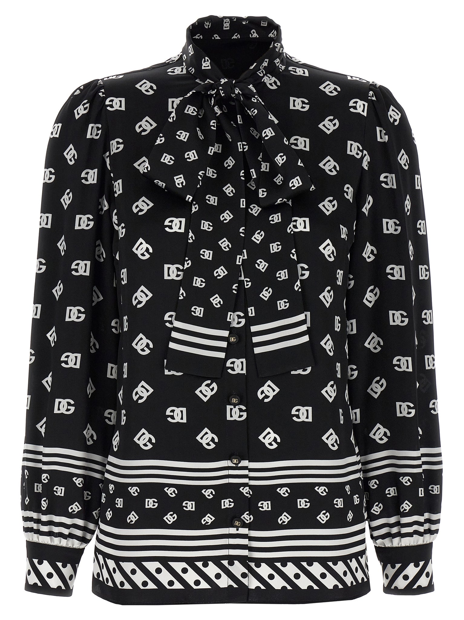 Silk twill shirt with all-over dg logo print, Lavallière collar, Front button closure, Long cuffed sleeves. Size and Fit - true to size fit