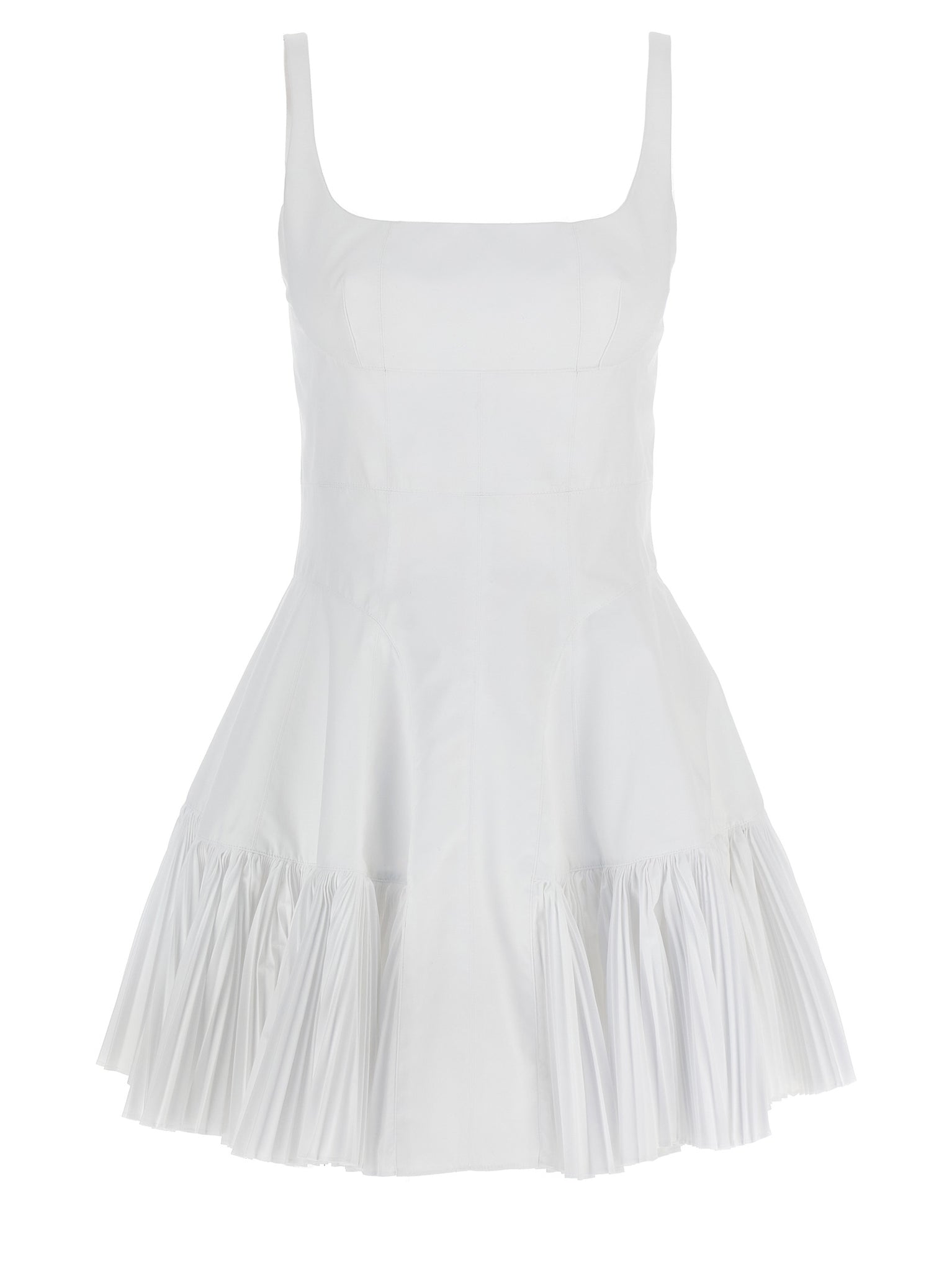 Cotton blend mini dress with pleated hem, Square neckline, Sleeveless, Back zip closure. Size and Fit - true to size fit