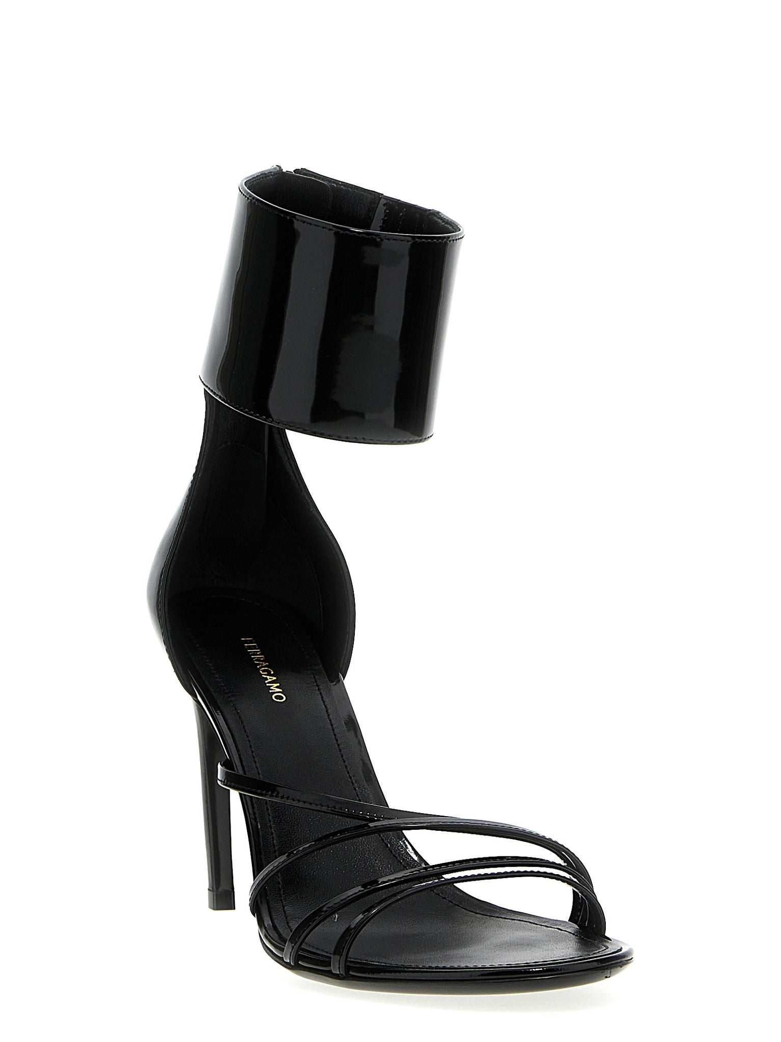 'clethra' sandals in shiny brushed nappa leather, Ankle strap with back zip, Curved heel. Size and Fit - US FERRAGAMO SIZE Heel: 8.5 cm 1C fit