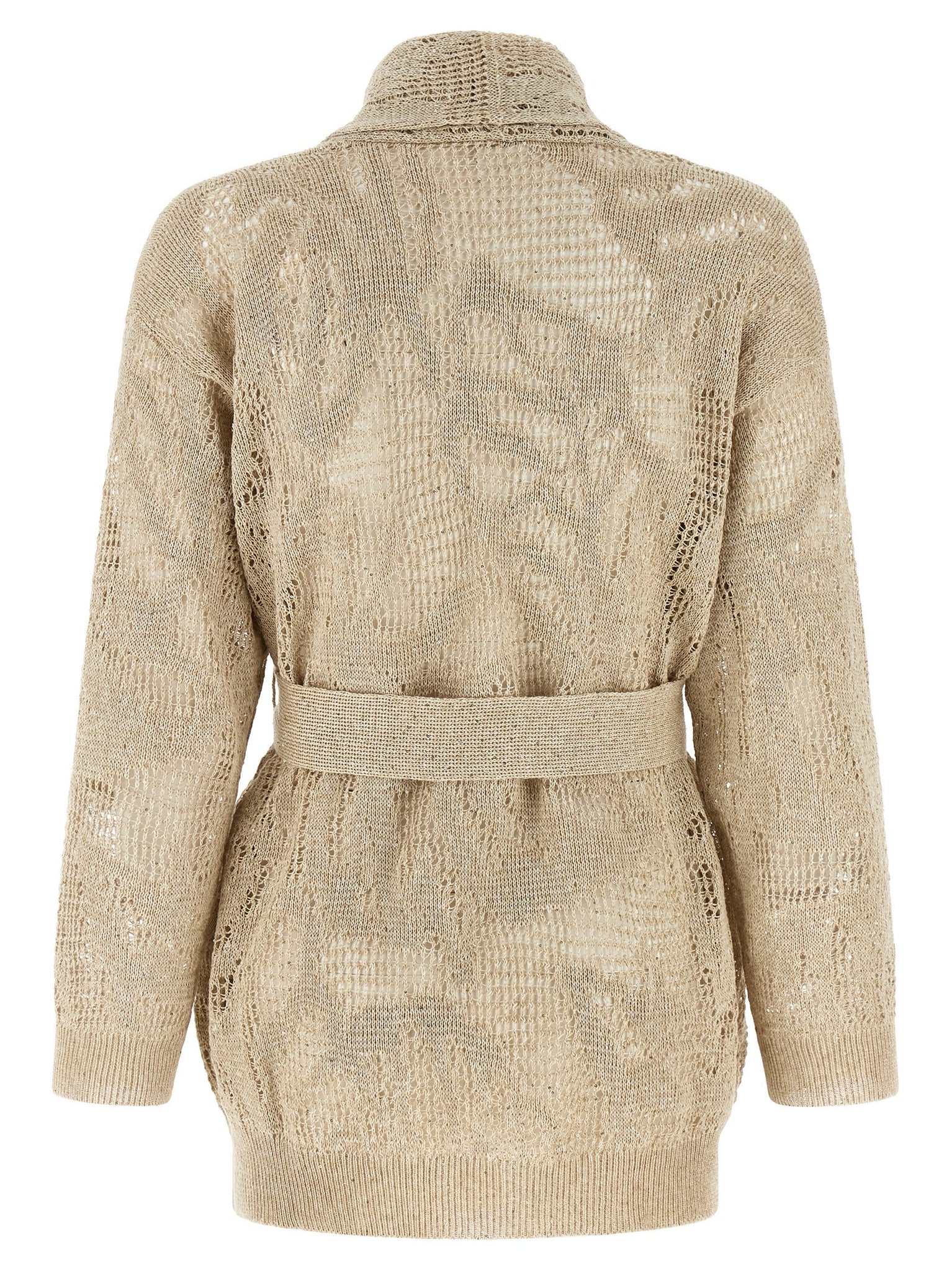 Cardigan in linen and cotton blend crocheted with micro sequin application, robe style, shawl collar, pockets, long sleeves with cuffs and dropped shoulder, removable belt. Size and Fit - true to size fit