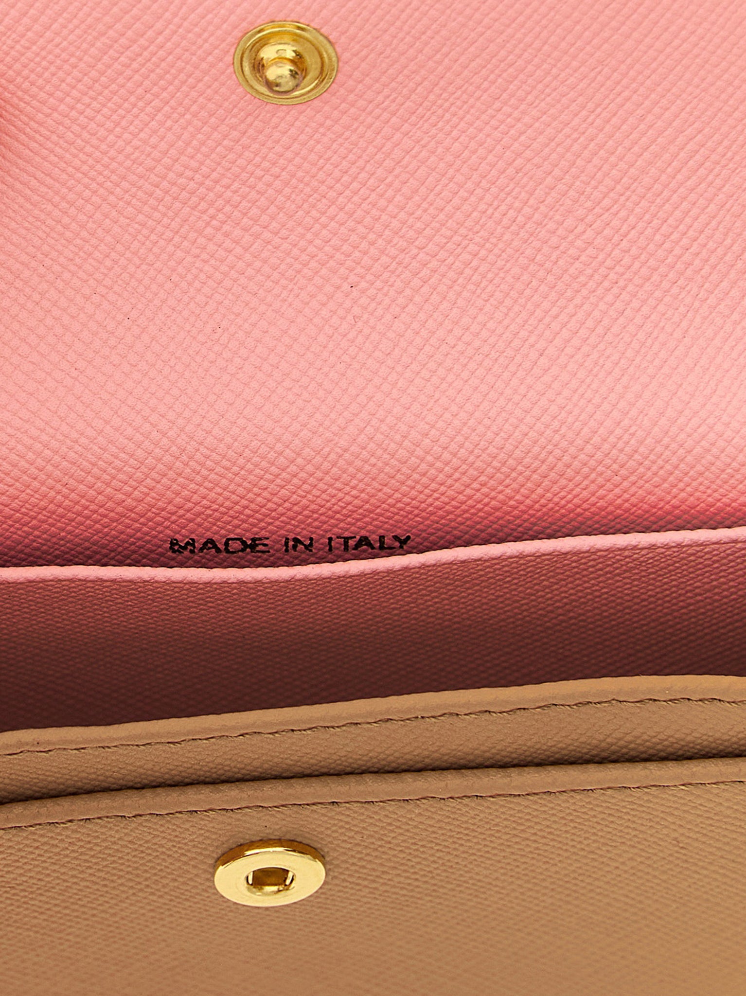 Saffiano leather business card holder with flap closure with snap button and front embossed logo. Size and Fit - W 11 x H 6.5 x D 2.5 cm