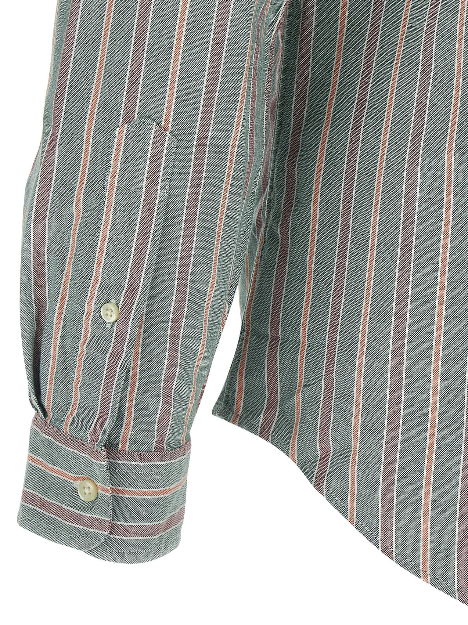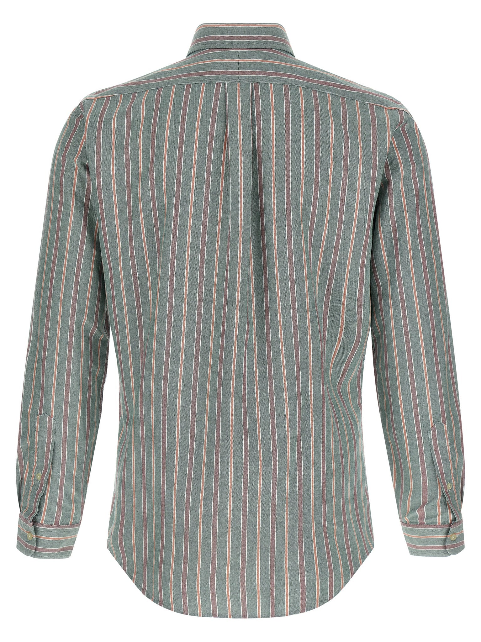Striped oxford cotton shirt, Pointed button‑down collar, Shaped waist cut, Front pocket with logo embroidery, Front closure with placket and buttons, Divided back yoke with box pleats, Long sleeves with cuffs. Size and Fit - custom fit