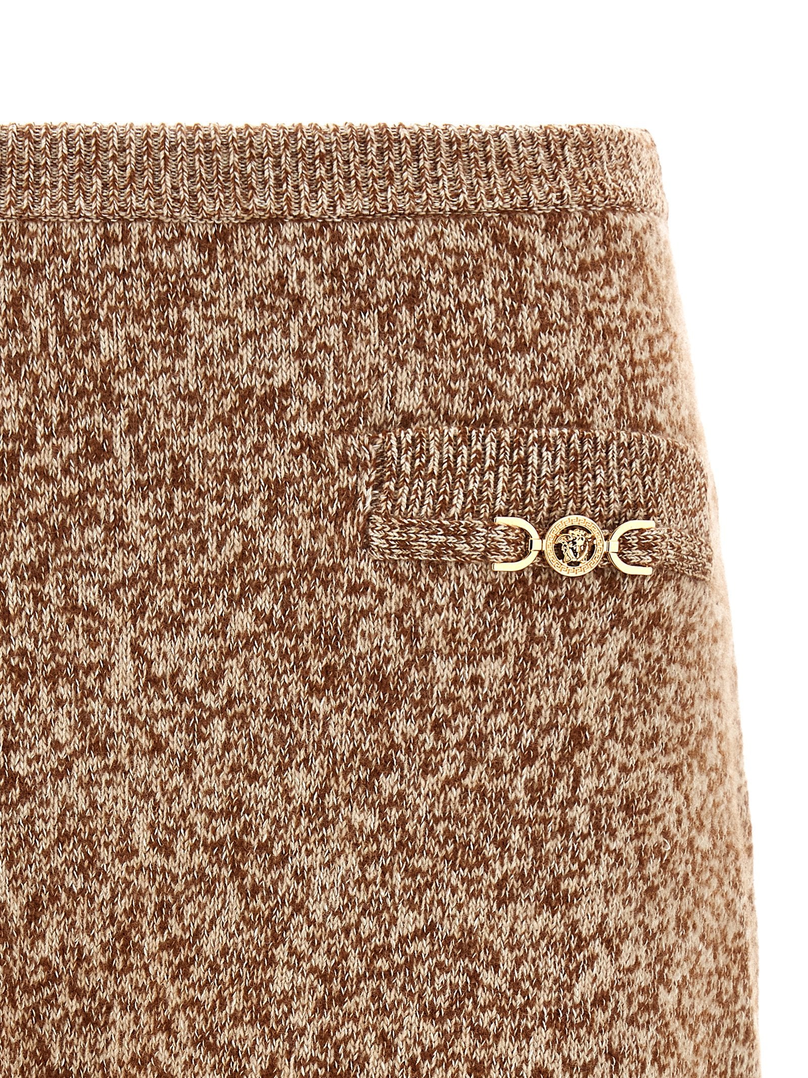 Discover a refined cashmere-blend mini that balances comfort and signature detailing for Fall wear. The elastic waistband and pocket accents with gold logo hardware provide practical ease and a polished finish. Designed for a true-to-size fit, this Versace piece pairs easily with knitwear or tailored layers to guide seasonal styling choices.