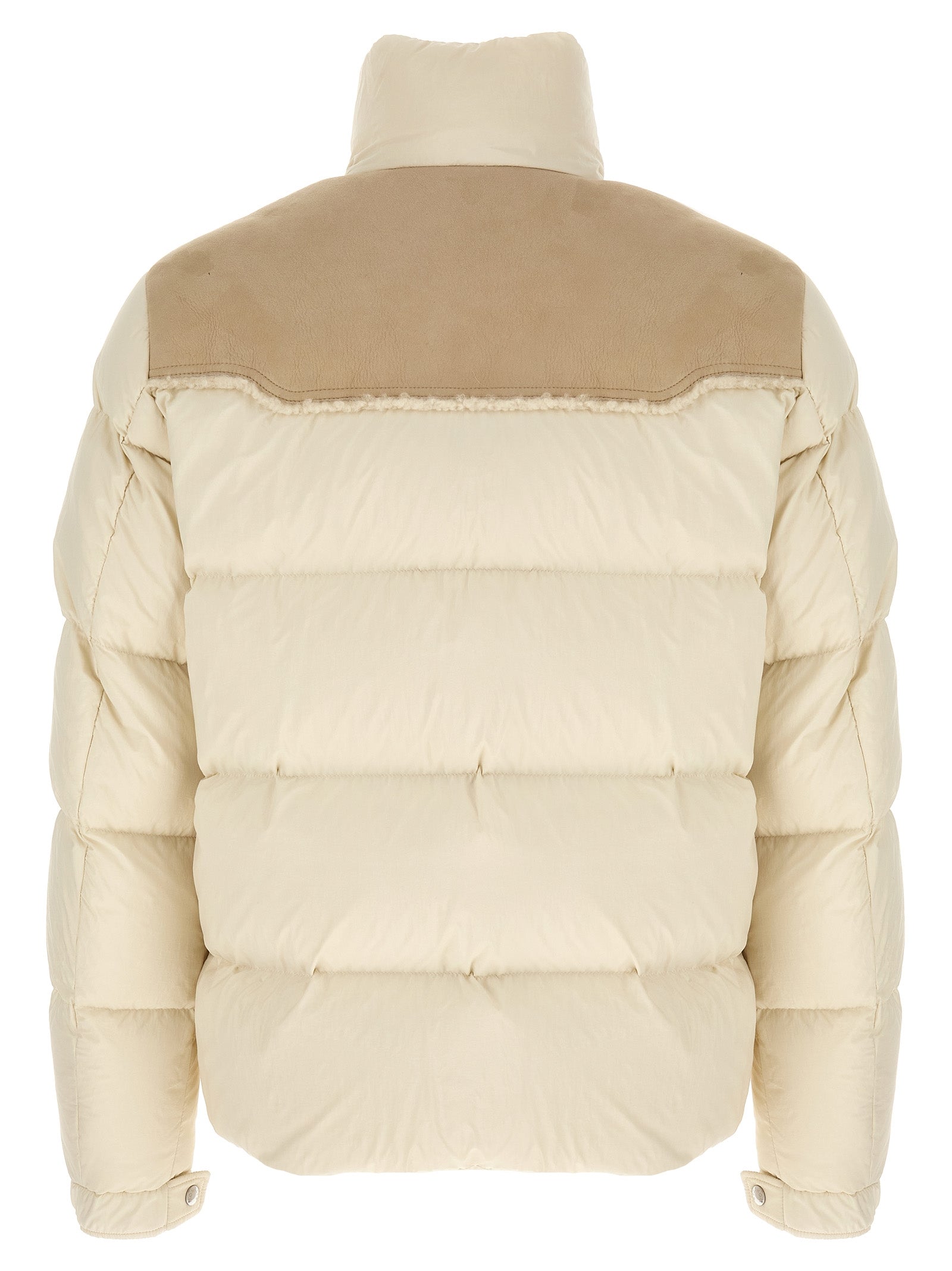 The Moncler Verine Down Jacket pairs warm goose down padding with a micro soft quilted nylon shell to keep you insulated without bulk. A suede yoke and long‑haired sheepskin trim at the standing collar add refined texture while a zip with snap placket, pockets, adjustable cuffs and drawstring hem offer practical protection and fit control. Designed true to size, this beige puffer balances polished details and everyday performance for cold‑weather wear.