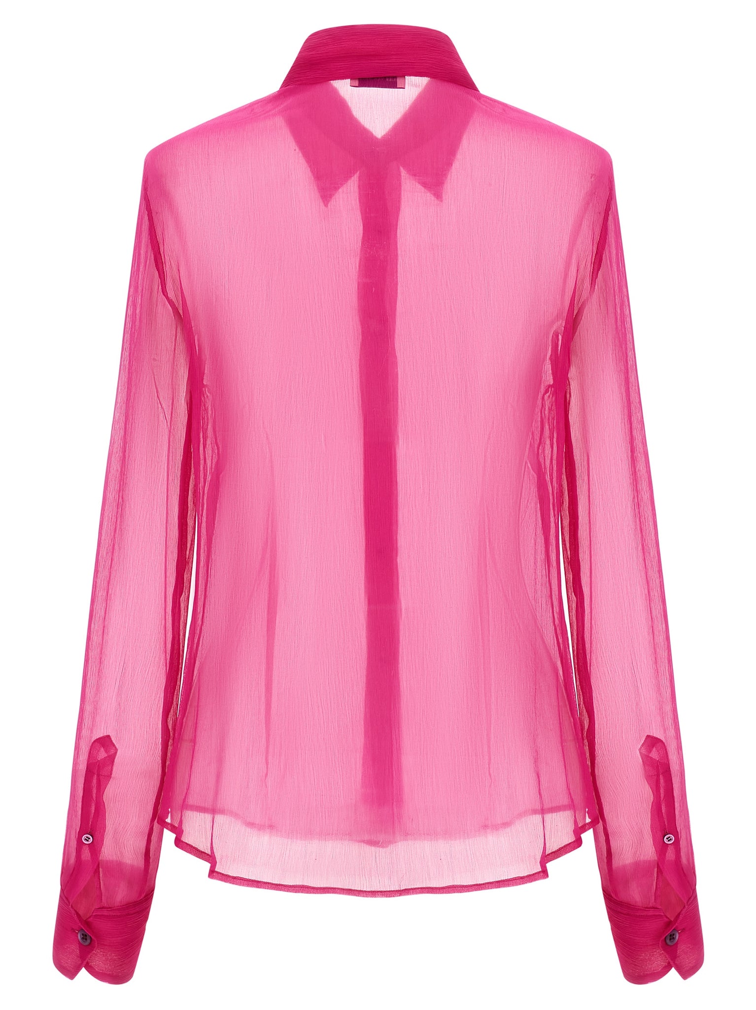 Discover a semi‑transparent washed silk muslin shirt in fuchsia that balances delicate drape with structured details for refined wardrobe layering. The pointed collar and front mother‑of‑pearl buttons provide polished closure while long cuffed sleeves and a rounded asymmetrical hem create subtle movement and modern proportion. True to French sizing, the fit follows expected measurements for adult women and pairs easily with tailored trousers or lightweight knits.