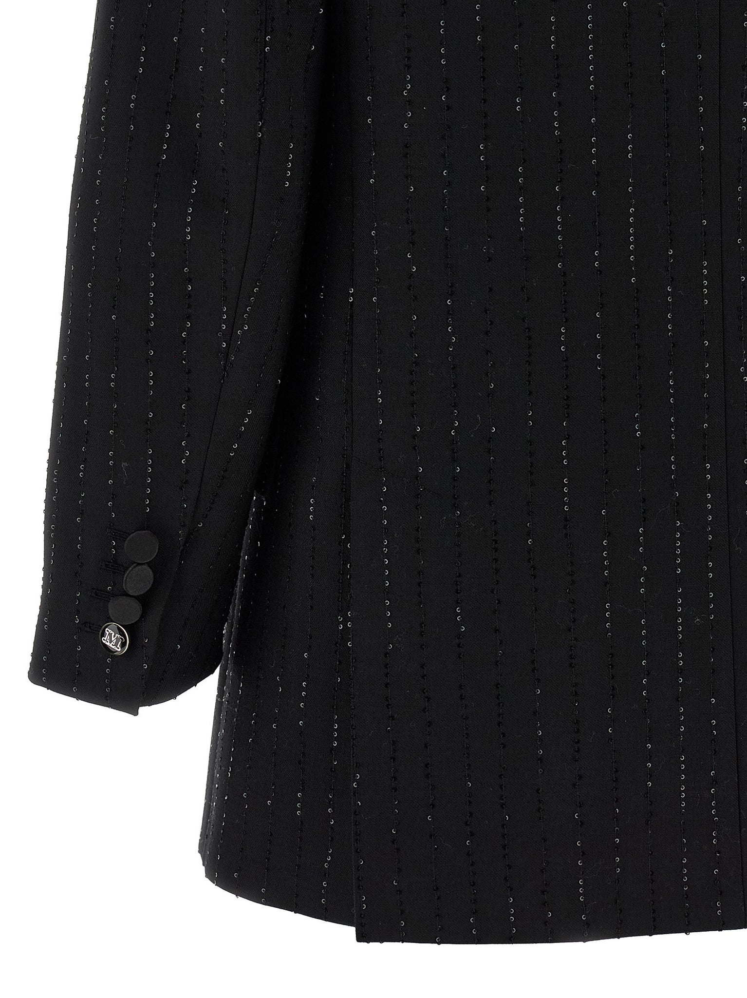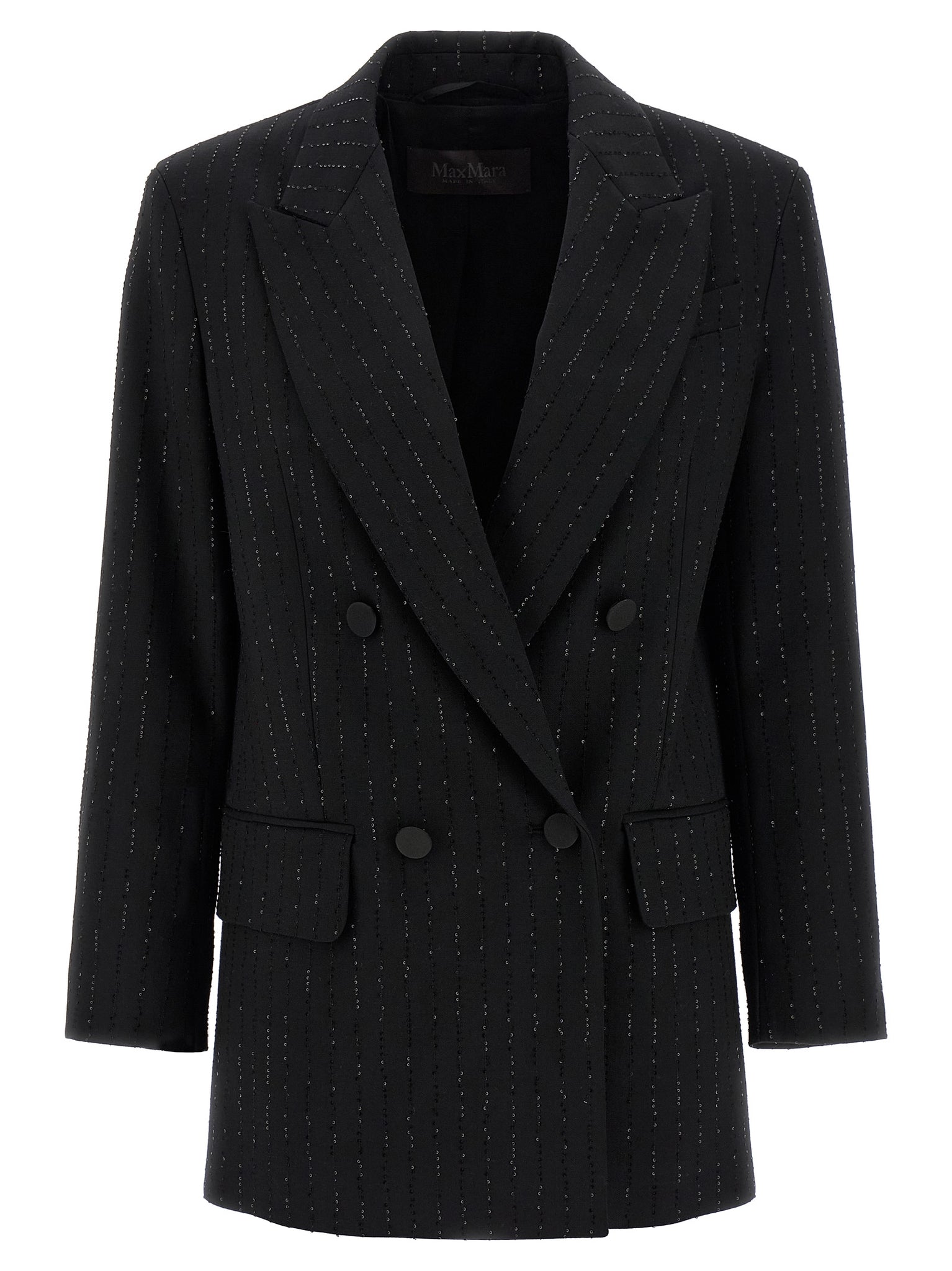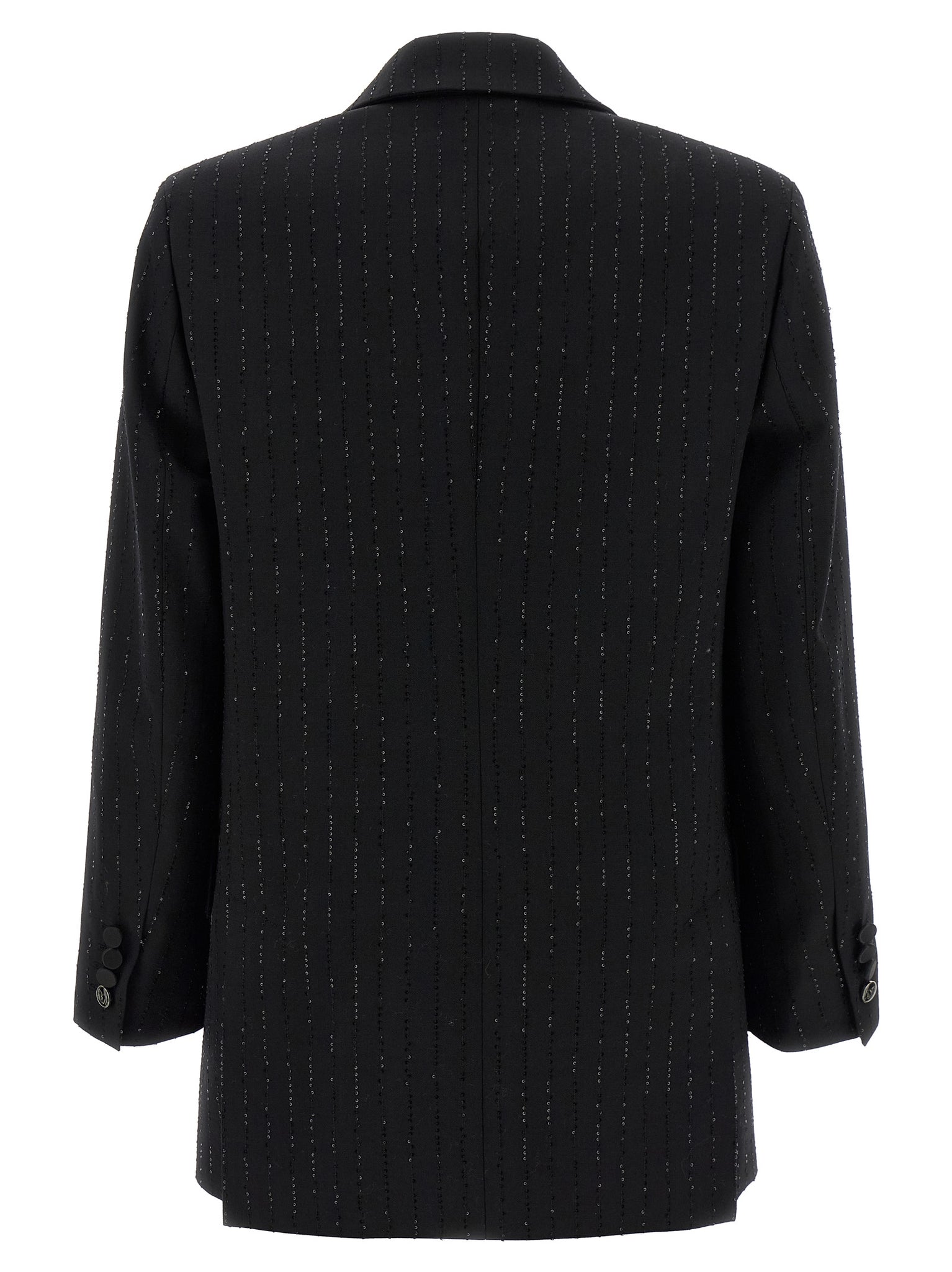 'appia' double-breasted blazer in wool sail with micro sequins embroidered in pinstriped effect, Front button closure, Peak lapels, Breast pocket, Flap pockets, Structured shoulder strap, Long sleeves, Back slits, Monogram jacquard fabric lining. Size and Fit - true to size fit