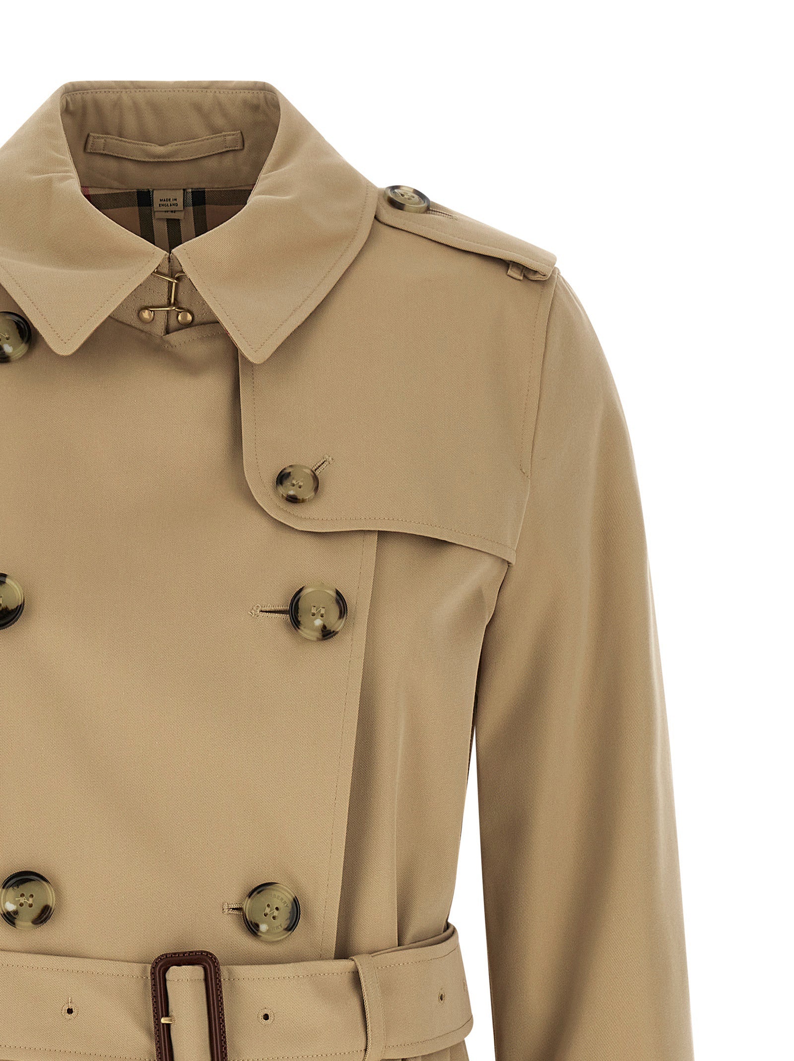 'kensington' short double-breasted cotton trench coat with button closure, Belt at the waist, Pockets, Long sleeves, Back vent. Sustainable: this product is made of organic cotton. Size and Fit - True to size fit UK sizing