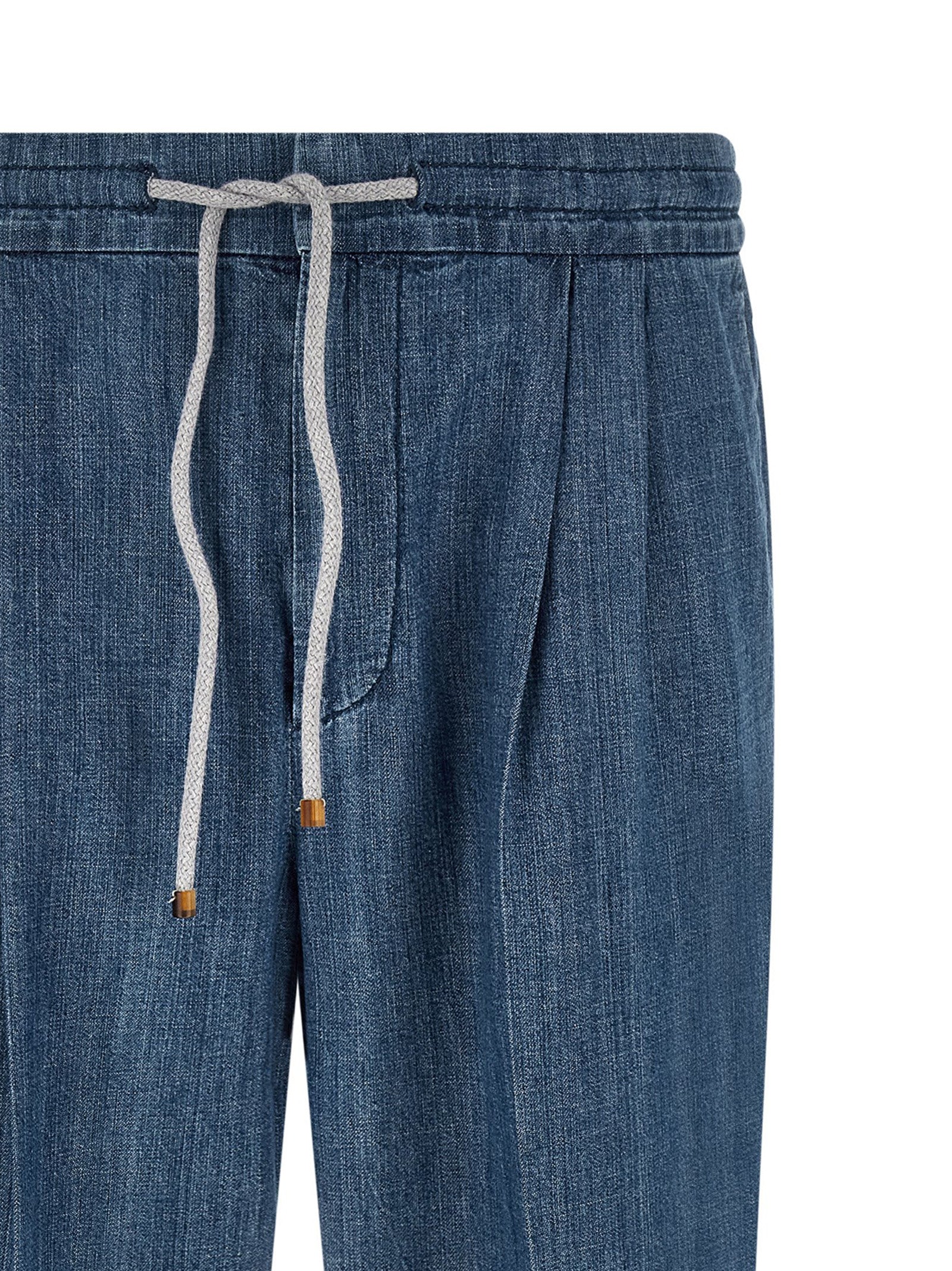 Light pure cotton denim jeans with fluid silhouette, Soft volume fit on the pelvis, Slightly lowered waist and close leg line, Double pleats, Stretched pleat, Drawstring elastic waistband, Zip and hook closure, Front american pockets, Back welt pockets. Size and Fit - true to size fit