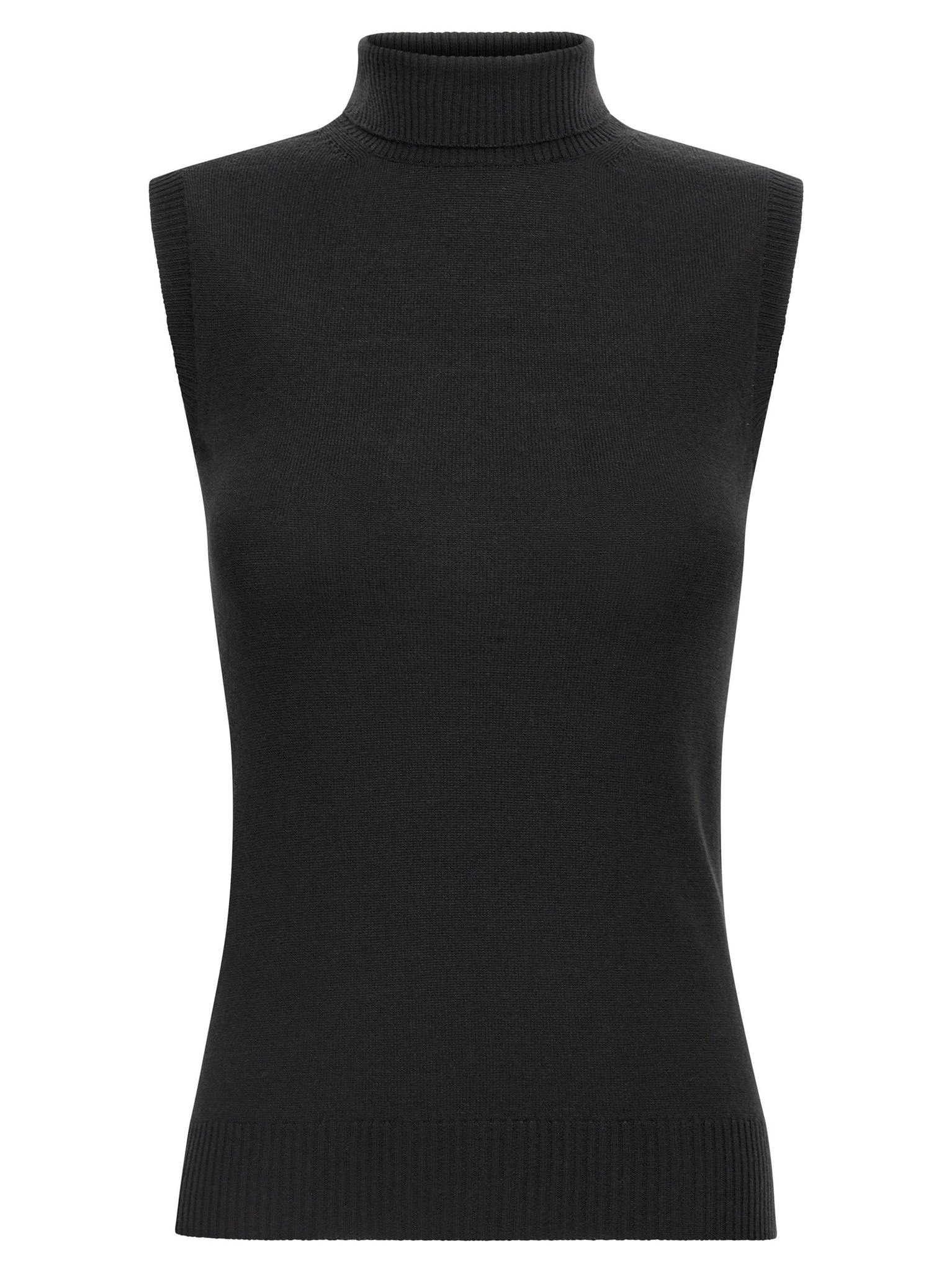 The Sportmax Vertigo Wolf sleeveless high‑neck sweater is knit in thin, pure wool for breathable warmth and a refined drape. Its fitted silhouette is true to size, offering clean lines that layer easily under jackets or stand alone for a streamlined look. Designed for fall wardrobes, this black piece balances minimalist styling with luxe fiber and precise tailoring.