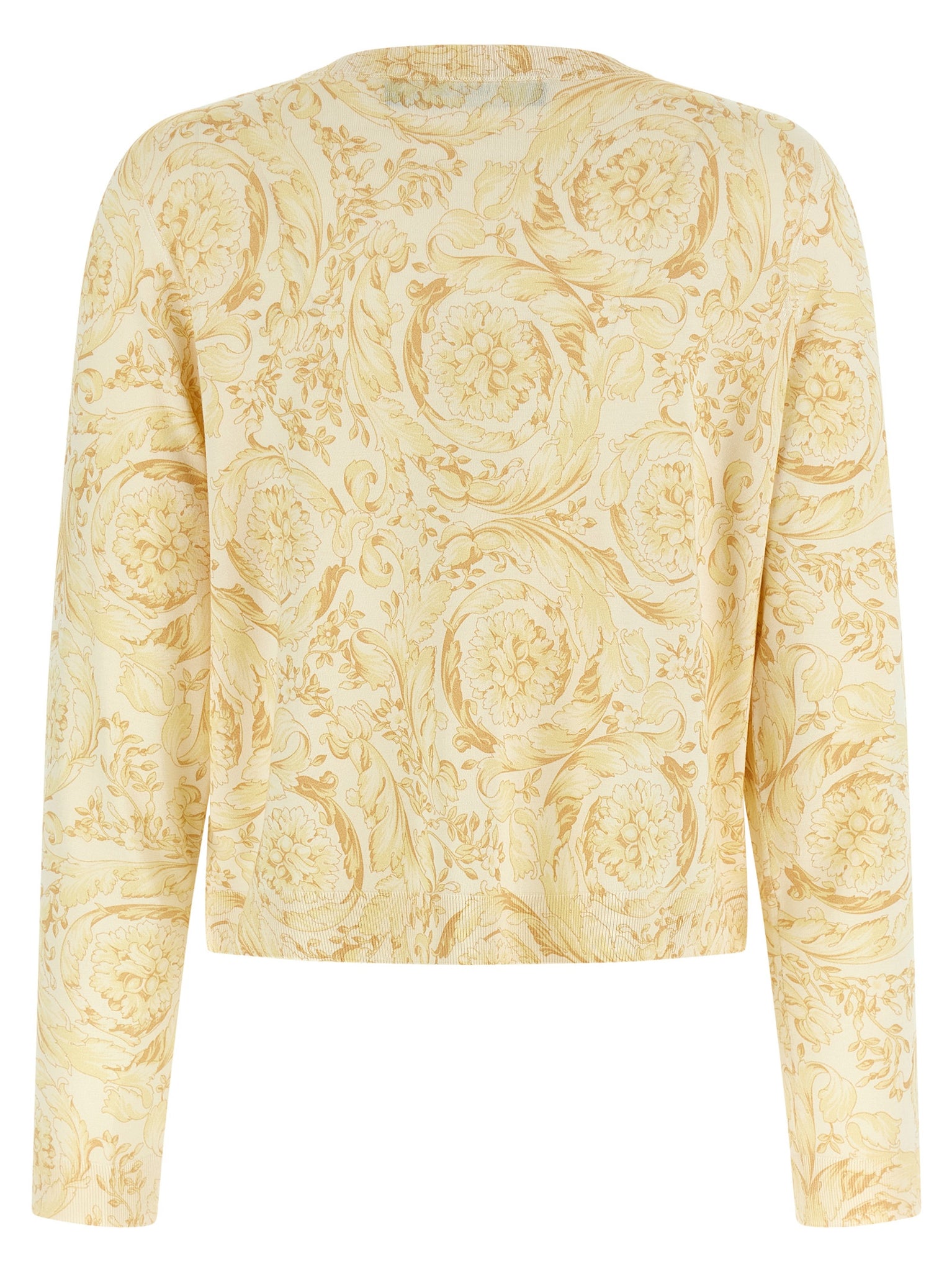 All-over 'Barocco 92' print silk cardigan, front metal 'La Medusa' button closure, crew neck, long cuffed sleeves. Size and Fit - true to size fit